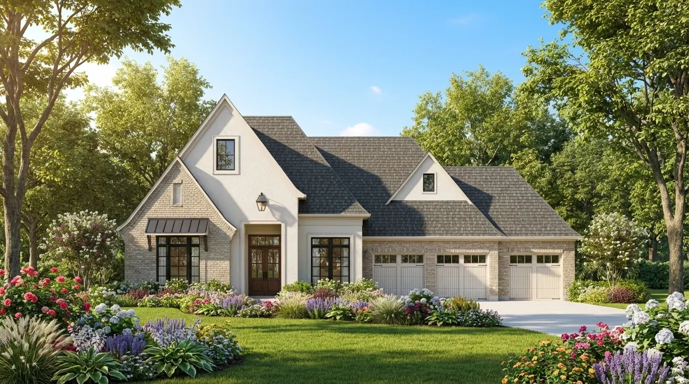As you approach Plan 20-072, a sense of warmth embraces you. The European style, with its light brick and stucco exterior, offers a modern twist on a classic American home. Imagine pulling into the three-car front-entry garage after a long day, the dark window frames accenting the welcoming facade.
